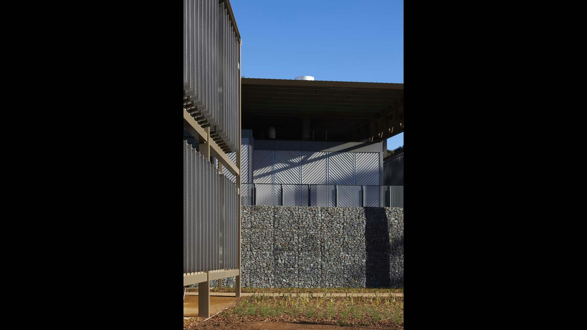 Light steel framed structures support large steel trussed roofs under which are built free standing component buildings clad in bright corrugated steel panels. The forms are reminiscent both of rural sheds and high technology manufacturing plants. The building has two main wings which are laid out along the natural contours of the site. Each has a deep layering of structure, sunshading and facade that create a series of permeable veils. The dark colour and slenderness of the steel structure and the complexity and colour of the overlapping layers create an impression that the building is a natural part of the site, reminiscent of the stands of gums which surround it. The building shares the site with the endangered Superb Parrot and takes their bright hues for its internal colour scheme.